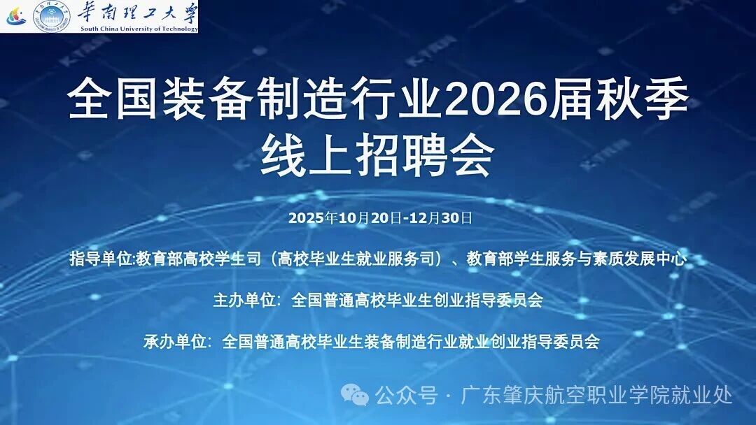 为深入贯彻落实党中央、国务院关于高校毕业生就业工作决策部署,抢抓“秋招”促就业关键期,推动装备制造行业人才供需精准对接,助力2026届高校毕业生高质量充分就业,全国普通高校毕业生就业创业指导委员会决定开展全国装备制造行业面向2026届高校毕业生秋季招聘活动。