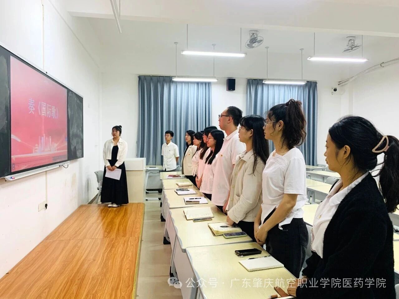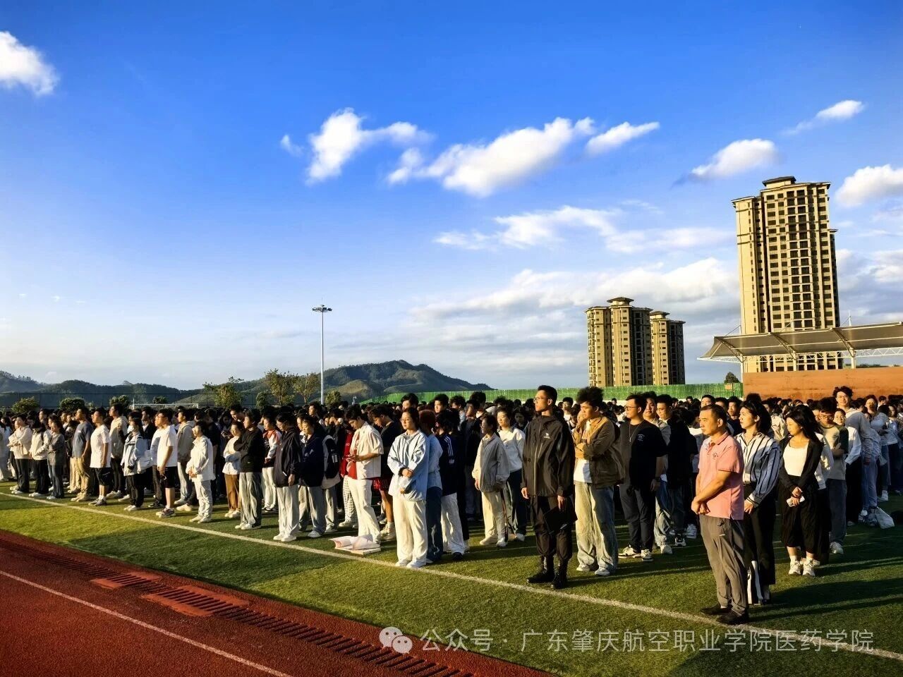 为厚植师生爱国情怀,凝聚新学期奋进力量,10月20日清晨,广东肇庆航空职业学院医药健康学院2025-2026学年第一学期第一次升旗仪式在学校田径运动场举