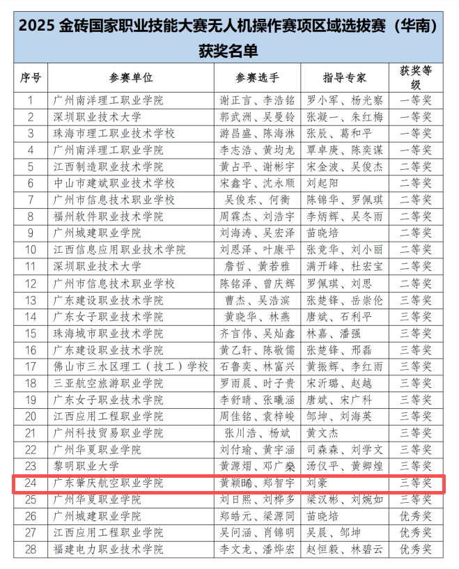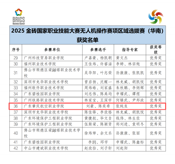 本次无人机操作赛项区域选拔赛由金砖国家工商理事会技能发展、应用技术与创新工作组主办,来自华南地区的各个职业院校的参赛选手同台竞技。我校师生脱颖而出:黄颖晞、郑智宇同学沉着应对复杂考核任务,凭借默契配合与稳定发挥斩获三等奖;刘豪老师和陈奕希同学凭借专业指导与出色表现荣获优秀奖。