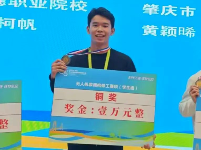 在无人机装调检修工学生组决赛中,黄颖晞同学凭借扎实的专业知识和精湛的实操能力,精准完成无人机装配、参数调试、故障排查等全流程操作,最终获得铜奖。在无人机驾驶技术学生组竞赛中,郑智宇同学以娴熟操控技巧和良好心理素质,顺利完成复杂环境下的精准悬停、障碍穿越等考核科目,荣获优胜奖。