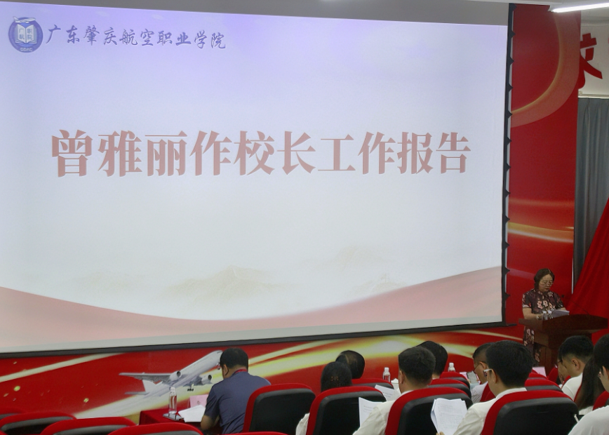 财务处黎展霞作《学校预决算报告》,职称评审办法修订工作组组长黄伟浩作《广东肇庆航空职业学院职称评审办法修订方案》修订情况的报告。