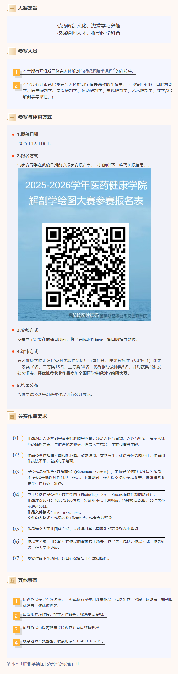 为提升学生对解剖学及医学课程的兴趣,培养学生创新思维与艺术表达能力,并为2026年全国医学生解剖绘图大赛选拔佳作,医药健康学院定于2025年10月起举办2025-2026学年人体解剖绘图大赛。比赛内容围绕人体解剖结构展开,展示人体的形态和生命奥秘。通过竞赛激发同学们的学习热情,深化对解剖学知识的理解和掌握。通过绘制人体解剖结构图,深入理解和记忆复杂的解剖学知识,在艺术创作中发掘自己的潜力,提升创新思维和艺术修养。现将有关比赛事项通知如下: