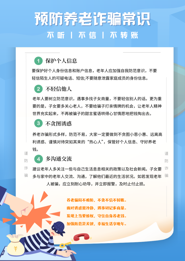 为了更有效地帮助老年人防范诈骗,我们总结了四大防骗法宝:保护个人信息、不轻信他人、不贪图诱惑、多交流沟通。我们鼓励老年人的家人将这些法宝牢记于心,并运用到日常生活中,以免让诈骗分子有可乘之机。