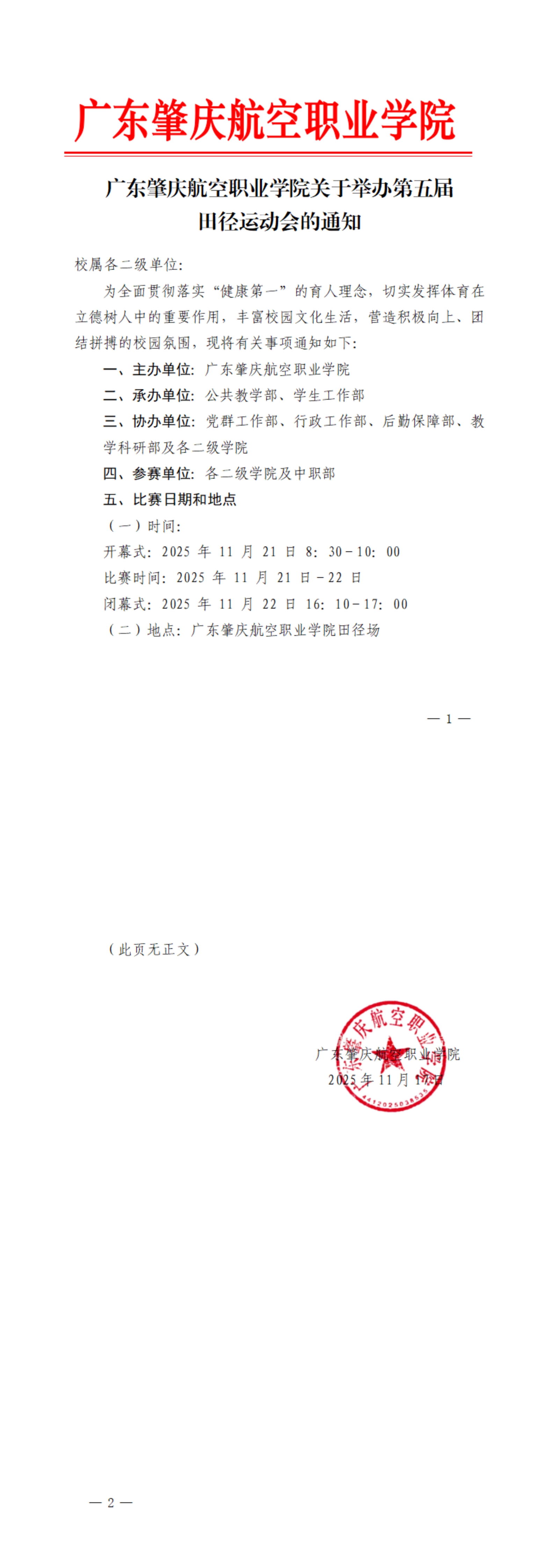 广东肇庆航空职业学院关于举办第五届田径运动会的通知