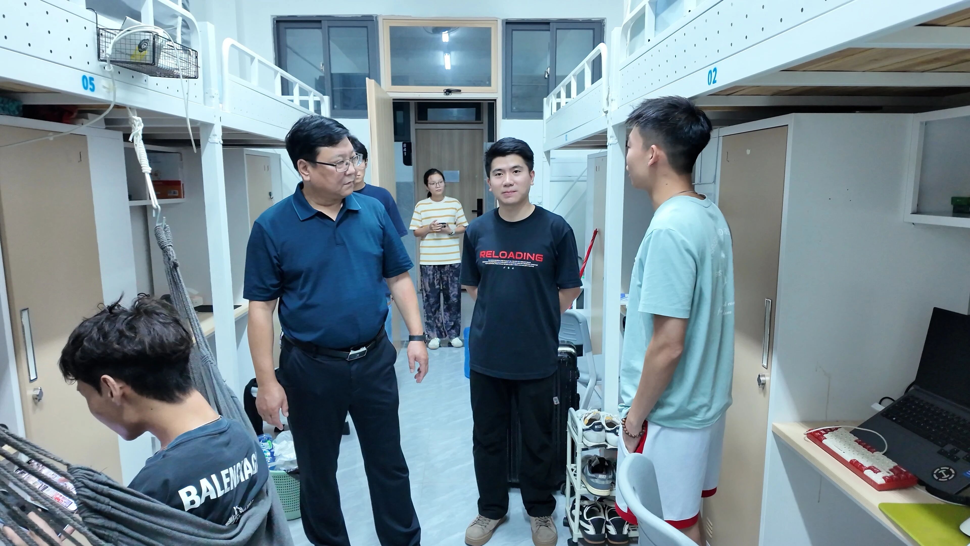 为深入了解新生入学适应情况,传递学院的温暖与关怀,9.13日晚,我院副院长王超,宋梦强老师,夏诗婷老师以及新生班助一同深入2025级看望刚刚入学的“萌新”们,为他们送上殷切叮嘱和暖心问候。     走访过程中,学院领导与辅导员们逐一走访新生宿舍。领导老师