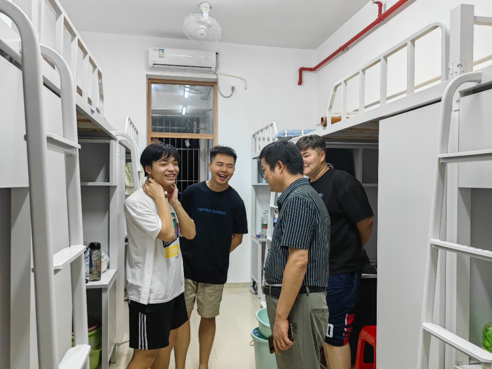 色彩斑斓的九月,正是萌新入学之时。为帮助我院全体新生更好更快地融入新集体与新环境,2023年9月15日晚,我院院长时有忠、新生辅导员邹智琳、老师曾森漩、陆泳涛、陈灶金以及2023级新生班助一同走进新生宿舍,对新生进行走访慰问。 走进宿舍里,学院领导和老师首先对2023级新生们的到来表