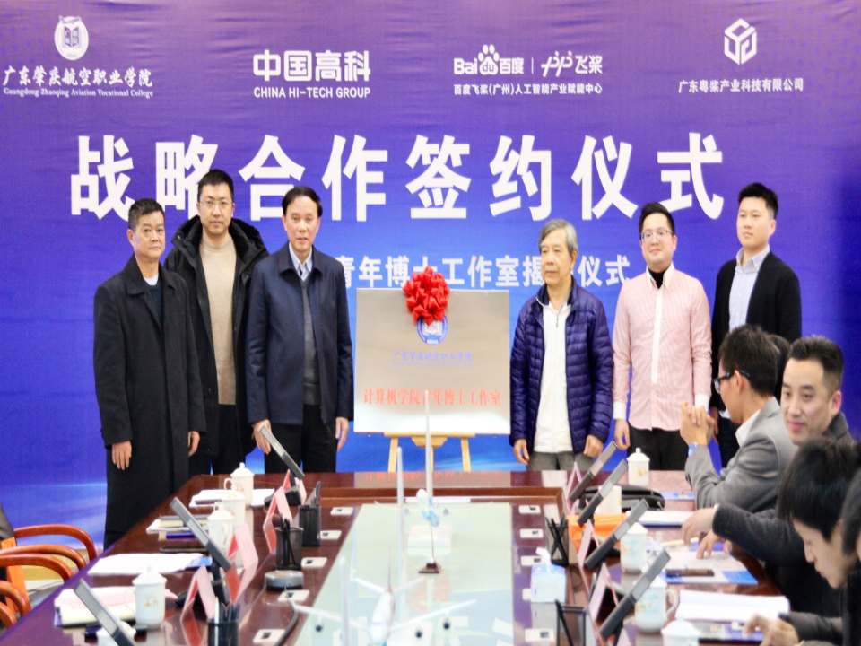 12月21日,在我校教学楼二楼会议室隆重举行了广东肇庆航空职业学院与中国高科、百度飞桨广东粤桨产业科技有限公司的战略合作签约暨计算机学院青年博士工作室揭牌仪式。 参加本次活动的有来自兄弟院校的专家、学者,知名高科技企业代表以及学校领导、师生代表等。如华南理工大学博士生导师林土胜教授、计算机教育专家