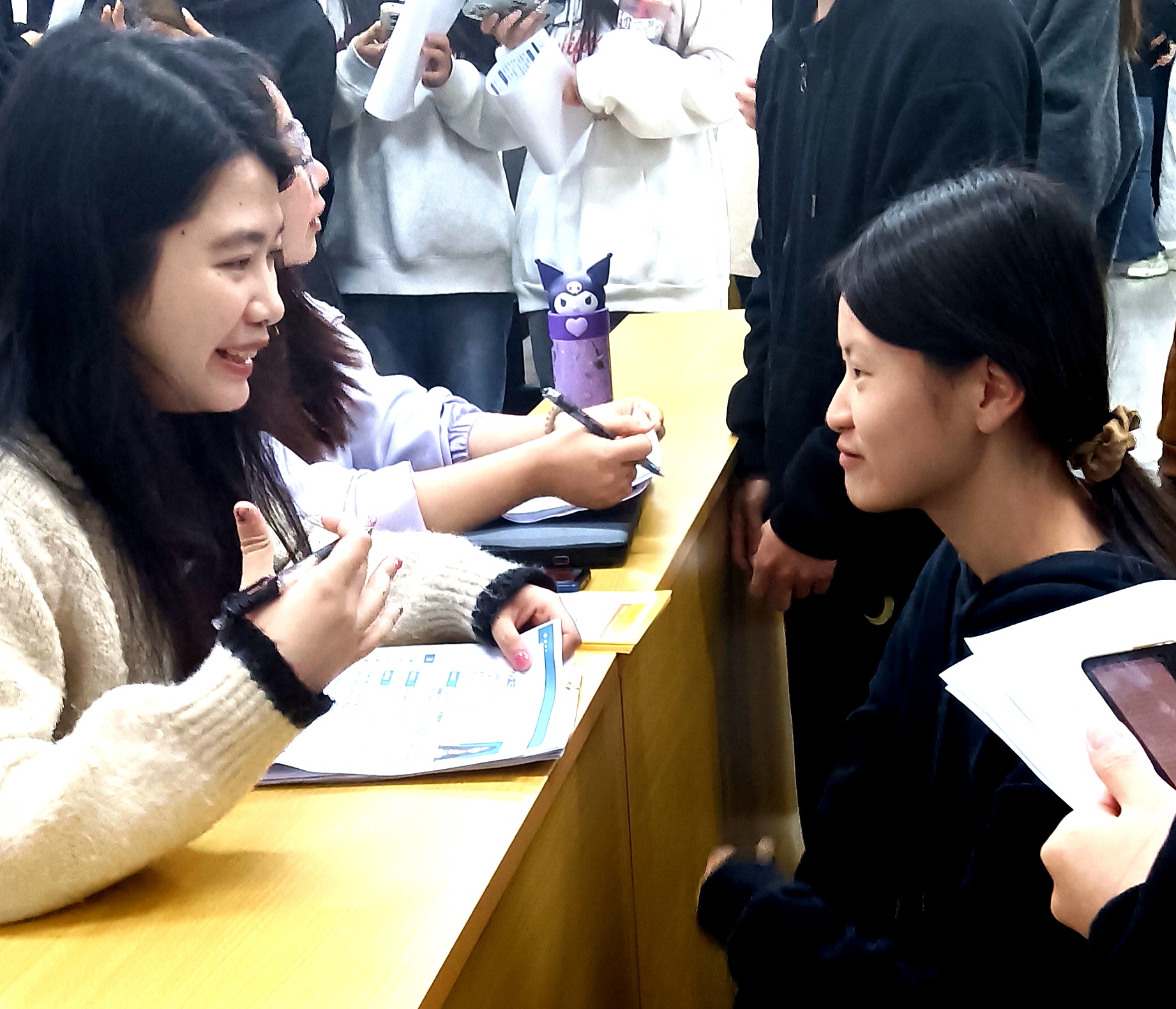 宣讲会上,迎熙堂医疗投资有限公司代表通过视频、数据与案例,系统呈现企业的发展脉络以及在医疗团队、培训体系、晋升空间等方面的核心就业优势,令在场学子们耳目一新,有助于在场学生进一步了解专业行情和就业信息。随后,在互动交流过程中,学生围绕职业发展路径、中医理疗技术应用、实习晋升机制等问题,积极与企业代表展开讨论。在面谈咨询环节上,企业现场开放实习岗位申请通道,针对不同专业的学生提供个性化的职业规划和就业指导,现场氛围热烈。