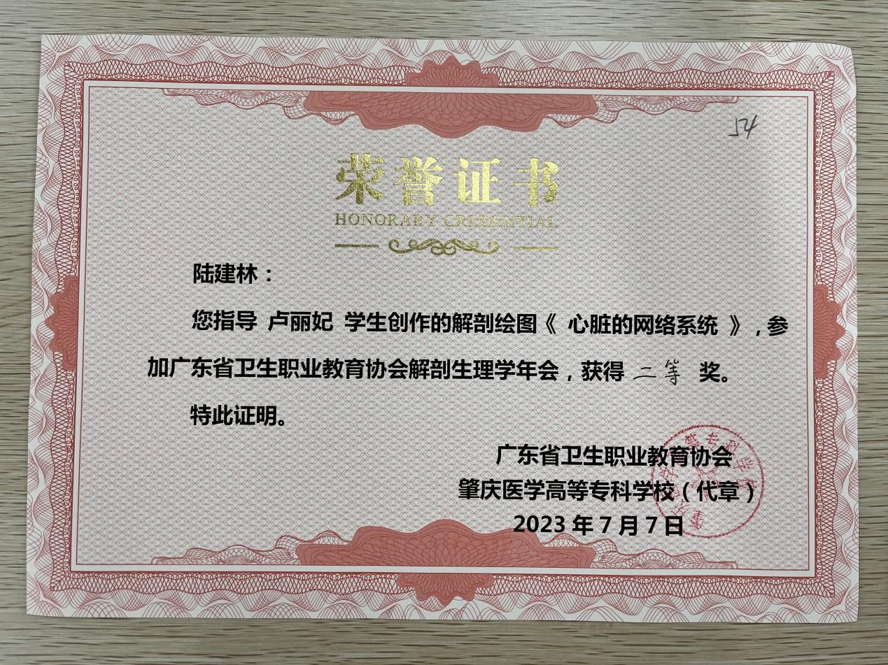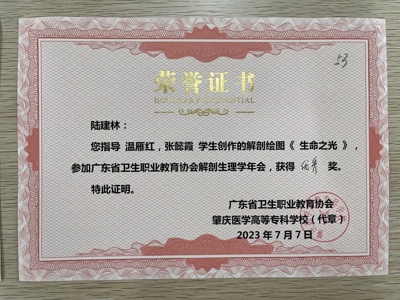 7月7日,广东省卫生职业教育协会暨广东省解剖学会卫生职业教育分会2023年解剖绘图大赛比赛结果公布,我院三位学生获奖。22护理1102班卢丽妃同学作品《心脏的网络系统》(指导老师:陆建林)获得二等奖;22护理1101班温雁红、张懿霖共同作品《生命之光》(指导老师:陆建林)获得优秀奖。