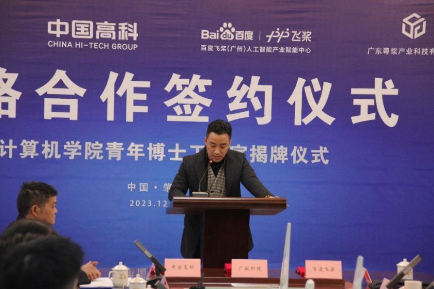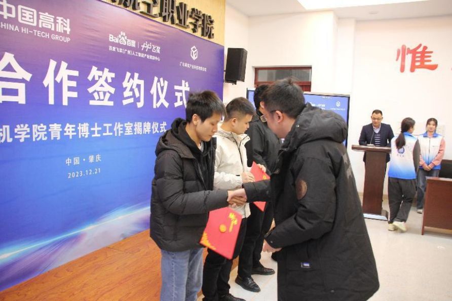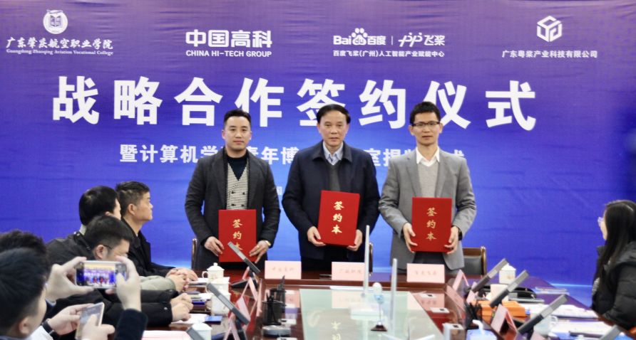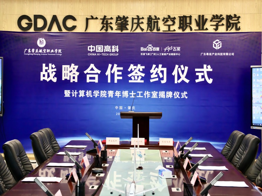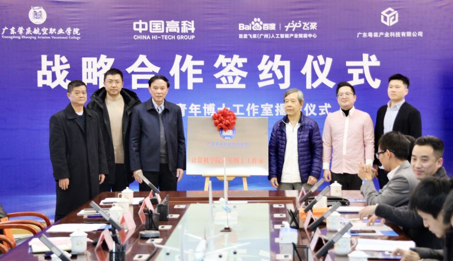 12月21日,在我校教学楼二楼会议室隆重举行了广东肇庆航空职业学院与中国高科、百度飞桨广东粤桨产业科技有限公司的战略合作签约暨计算机学院青年博士工作室揭牌仪式。