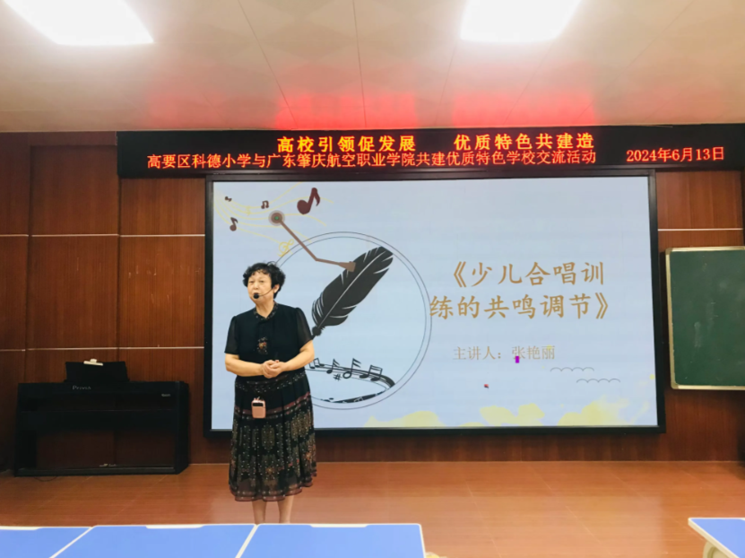 2024年11月6日下午,广东肇庆航空职业学院与高要区科德小学共同探讨如何通过资源共享和双向合作,促进双方的共同发展。本次活动以张艳丽院长的声乐基础课以及学生代表的舞蹈课展示展开交流。活动后,肇庆航空职业学院的专家老师和科德小学的领导班子就优质特色学校共建进行深入交流、探讨。