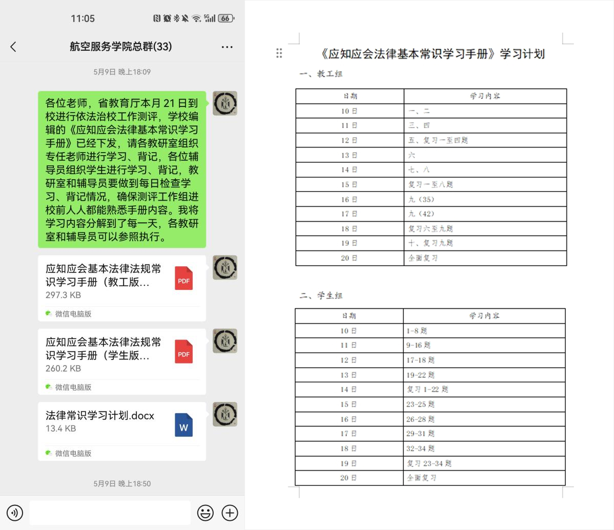 接到学校组织开展《应知应会法律基本常识学习手册》学习的通知后,学院迅速研究制定了学习计划(见附件)和学习方案,将学习内容分解到每一天,由教研室和辅导员分别组织专任老师和学生进行学习、背记,并每日检查学习效果。