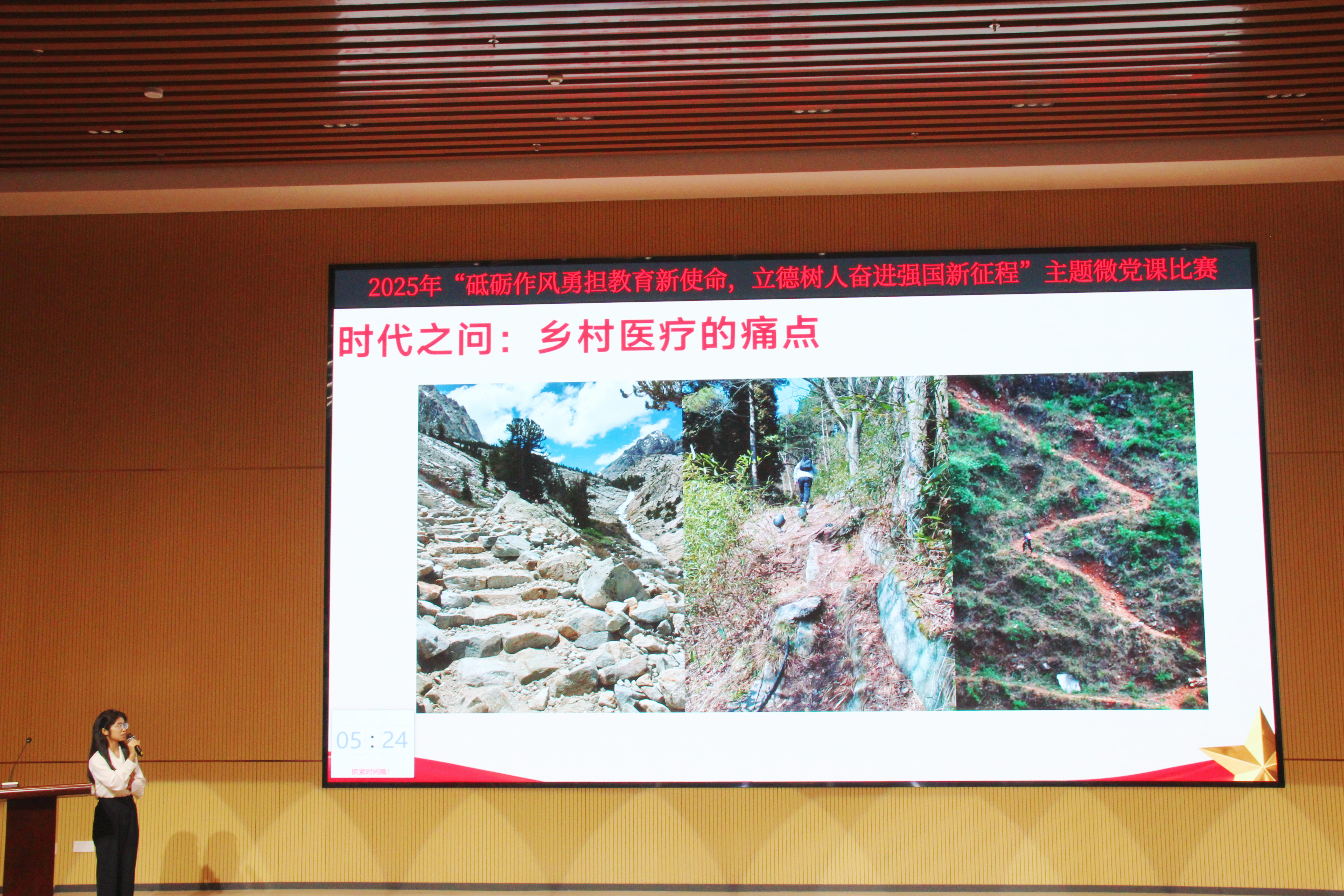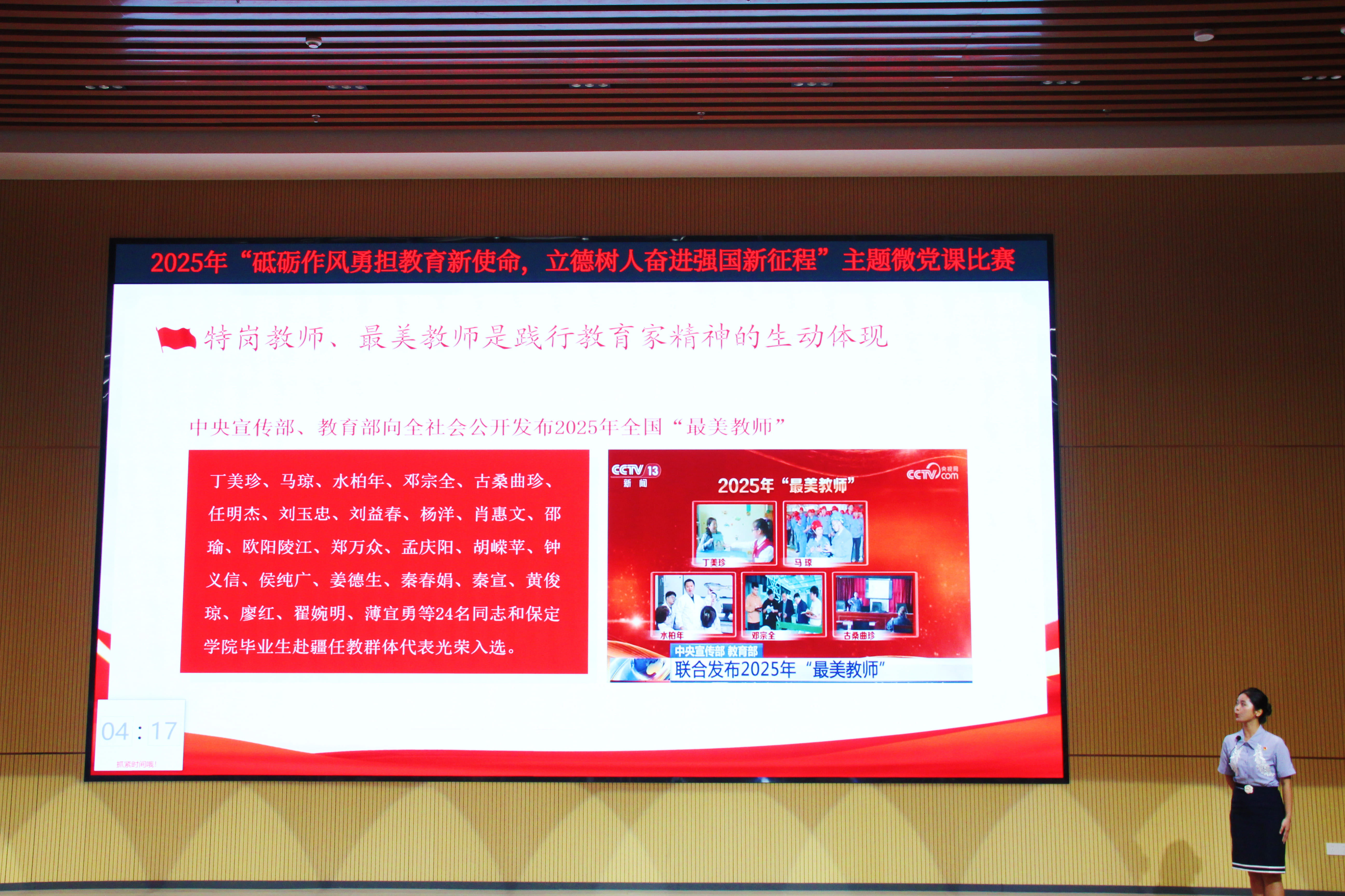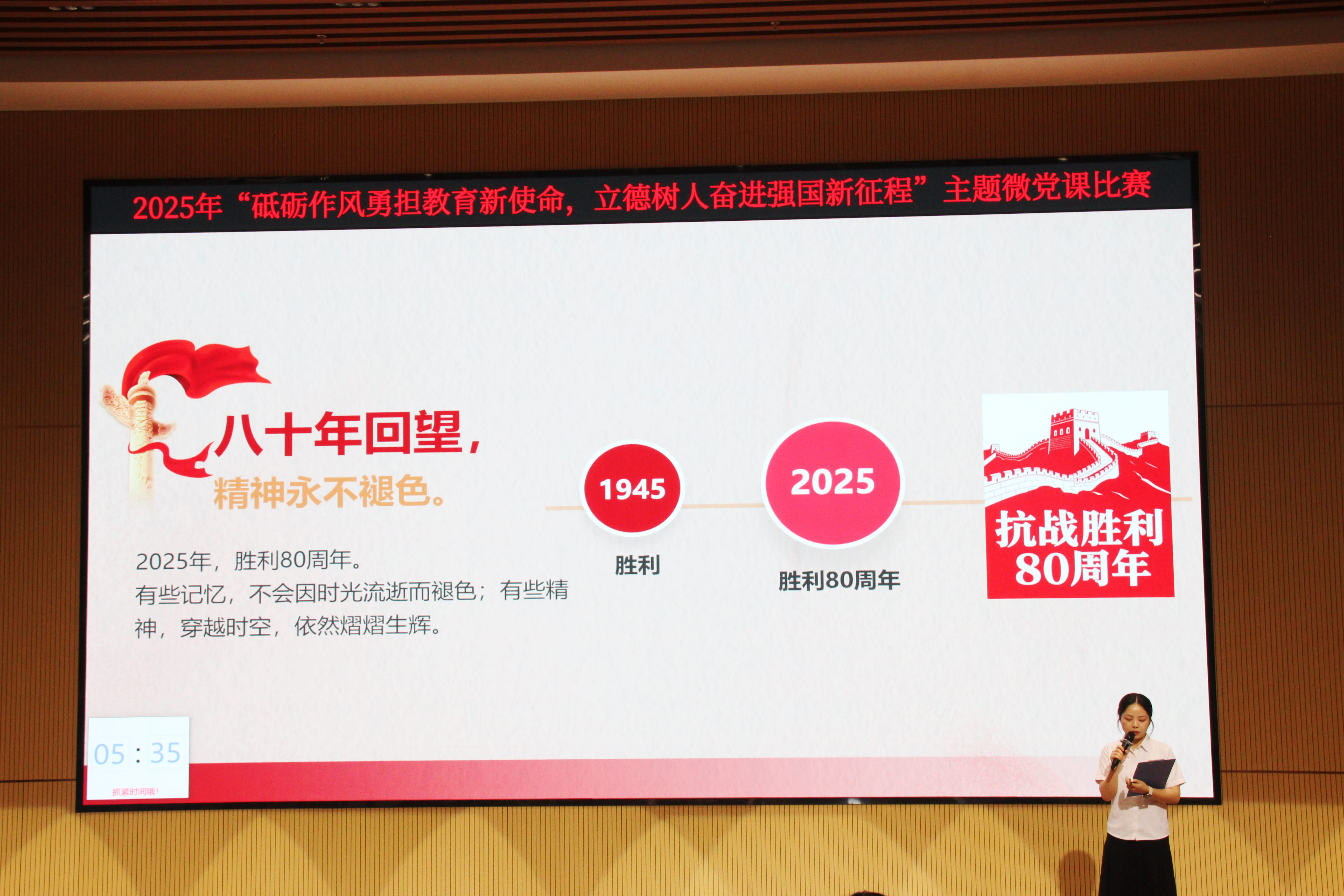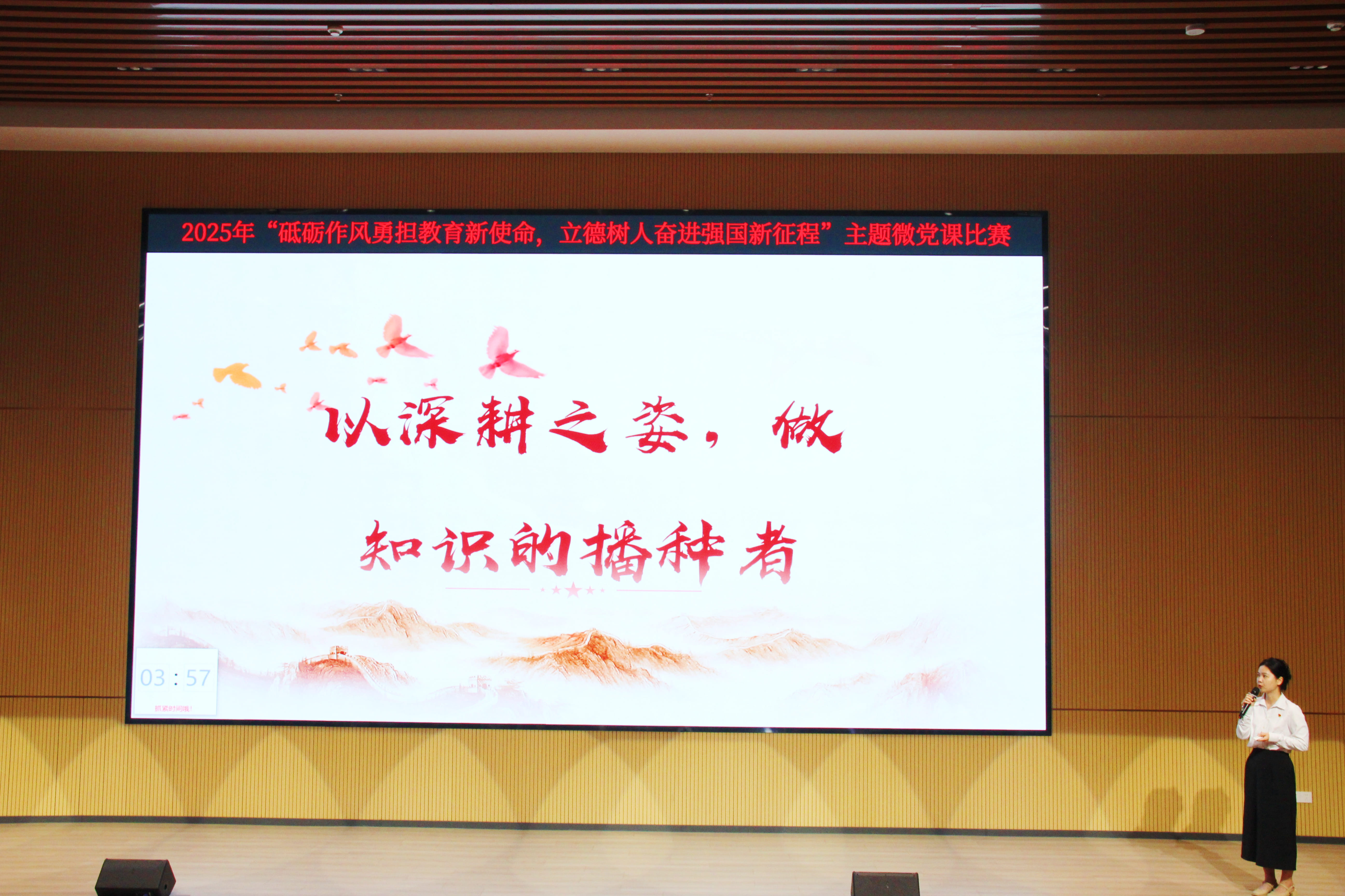 比赛现场,由9个党支部推荐的12名教师党员依次登台,他们以“初心”为火种,以“案例”为透镜,将党的理论融入身边故事,用“小切口”折射“大主题”,以“微讲述”激发“深思考”,诠释作风传承的精神密码,呈现立德树人的实干答卷。