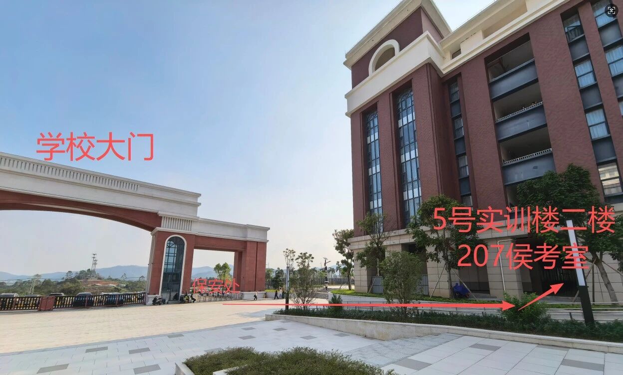 到学校门口向保安报备(自驾到校请把车辆停在校外停车场),进校门直走左转到实训楼二楼207候考室等待考试管理员通知考试和统一收取考试费用。