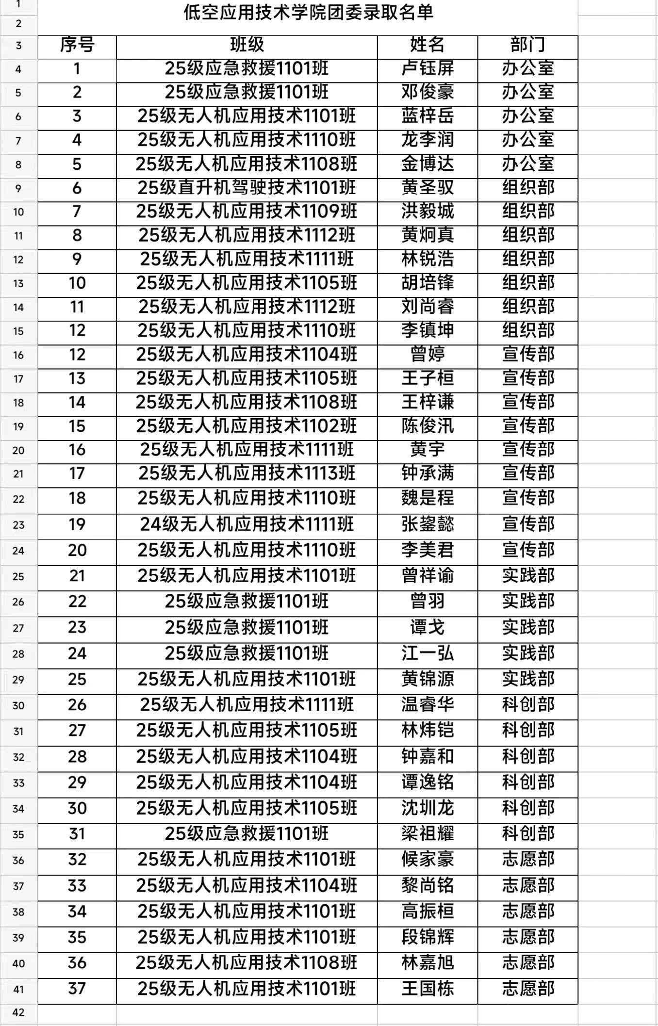 恭喜所有脱颖而出的同学!加入院团委,既是一份荣誉,更是一份责任。这里是青春绽放的舞台,是能力提升的沃土,更是服务同学、奉献集体的阵地。未来,希望你们能以“勤学、笃实、创新、担当”的态度,快速融入集体,在各自的岗位上发光发热,携手打造更具活力、更有温度的院团委,共同书写低空应用技术学院团学工作的崭新篇章