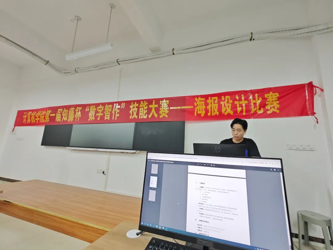 海报作为一种直观的宣传方式,在许多领域中都发挥着重要作用。为了激发广大学生的海报创作热情,提高同学们的动手制作能力,同时让同学们积累更多的社会实践经验。计算机学院于2024年5月28日19:00在实训楼402课室举办了第一届知藤杯“数字智作”技能大赛——海报设计比赛。